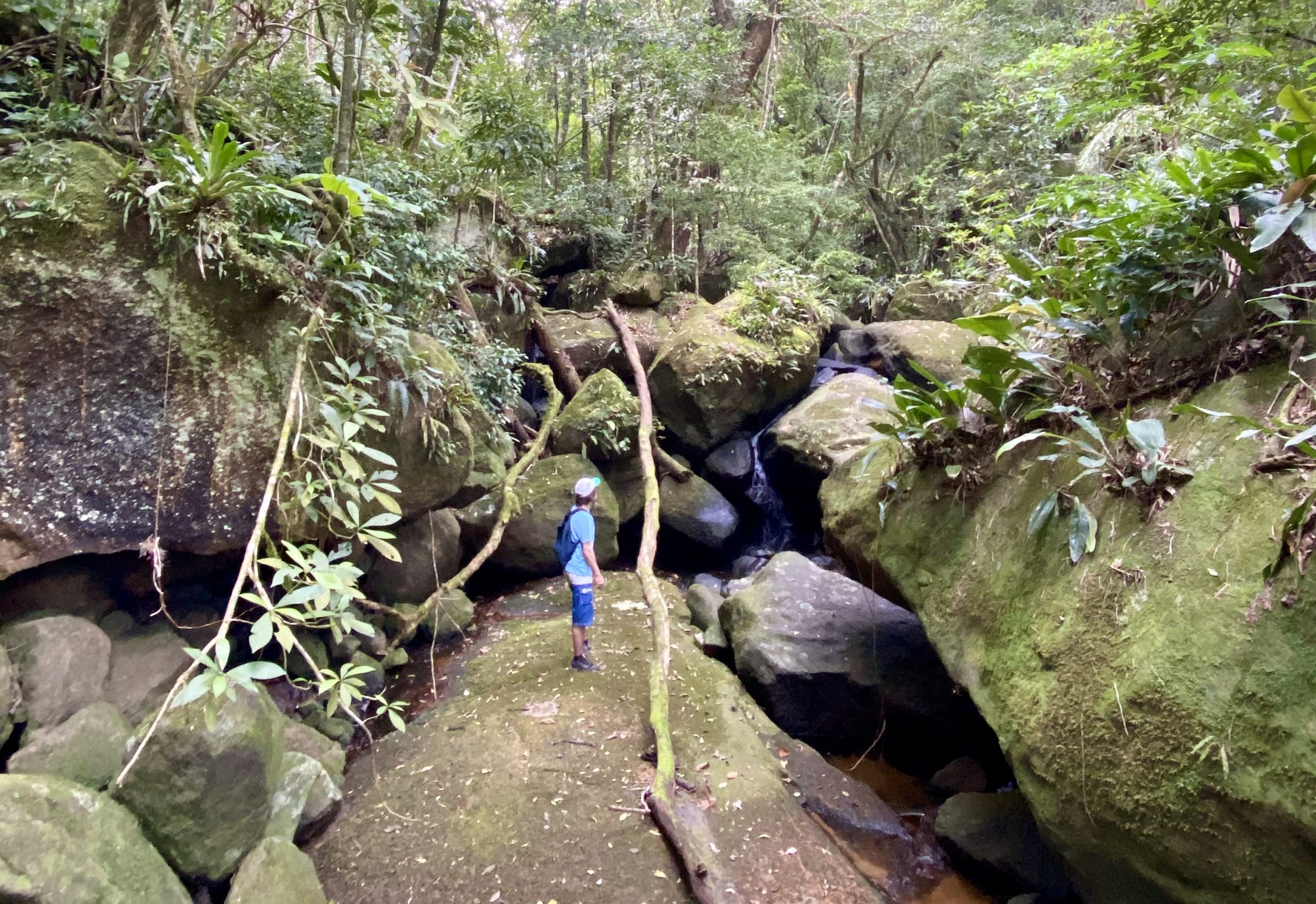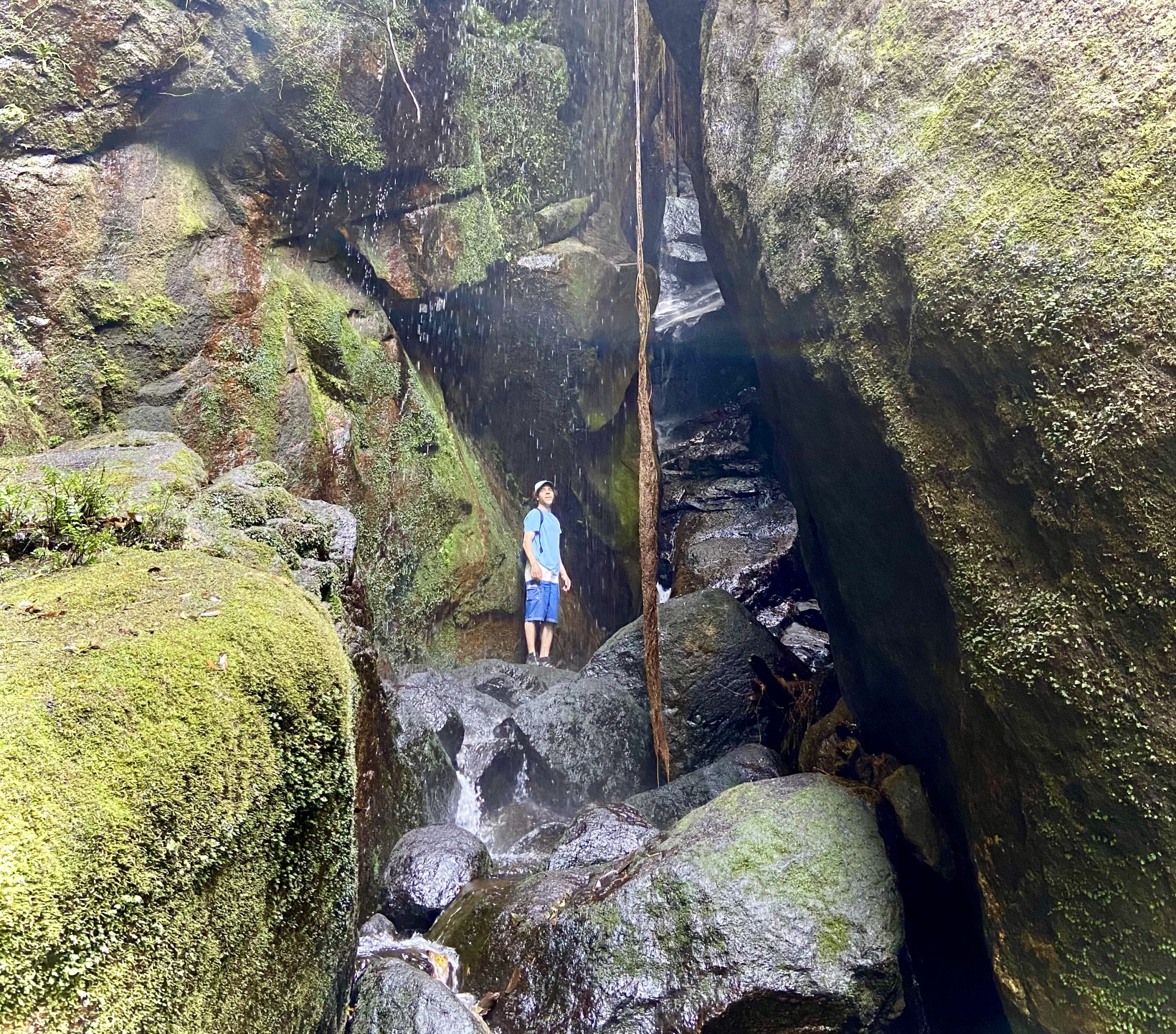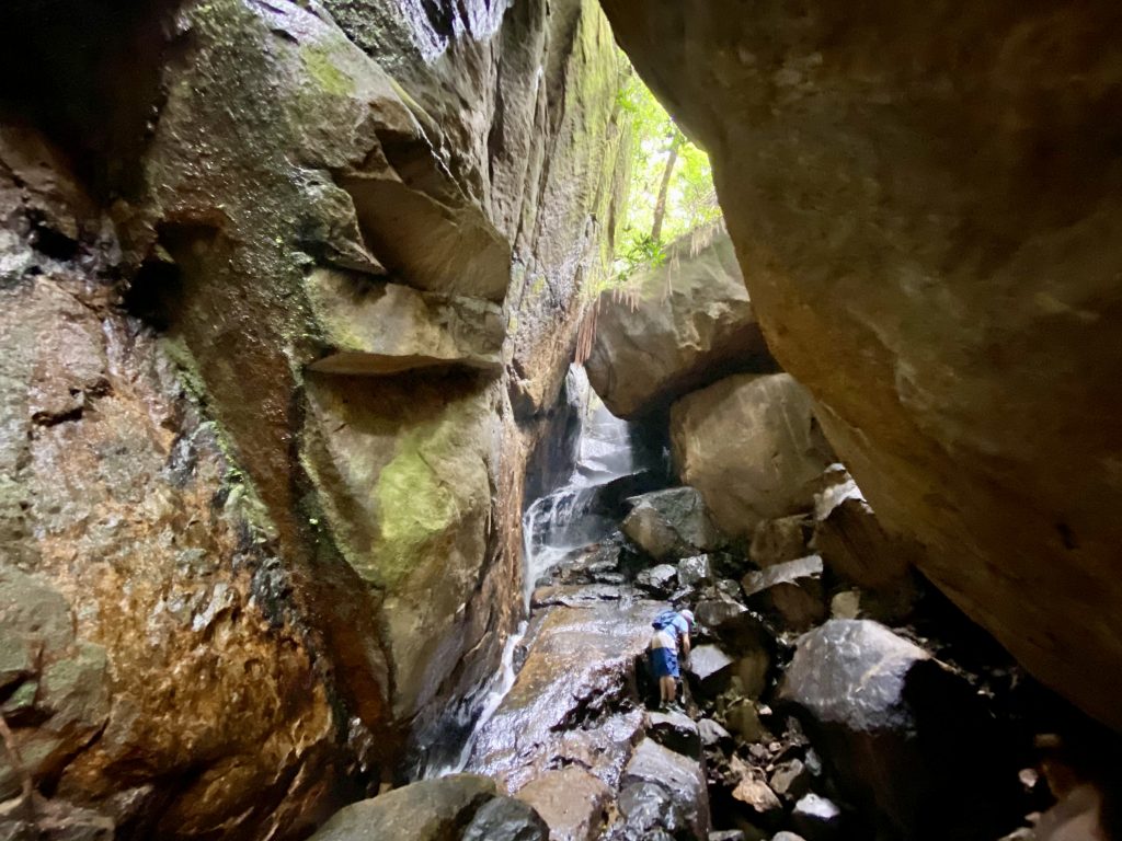 “Fácil! Uma hora e meia na mata com muitos trechos de subida de cachoeira por pedras escorregadias, chegaremos numa gruta muito doida.”