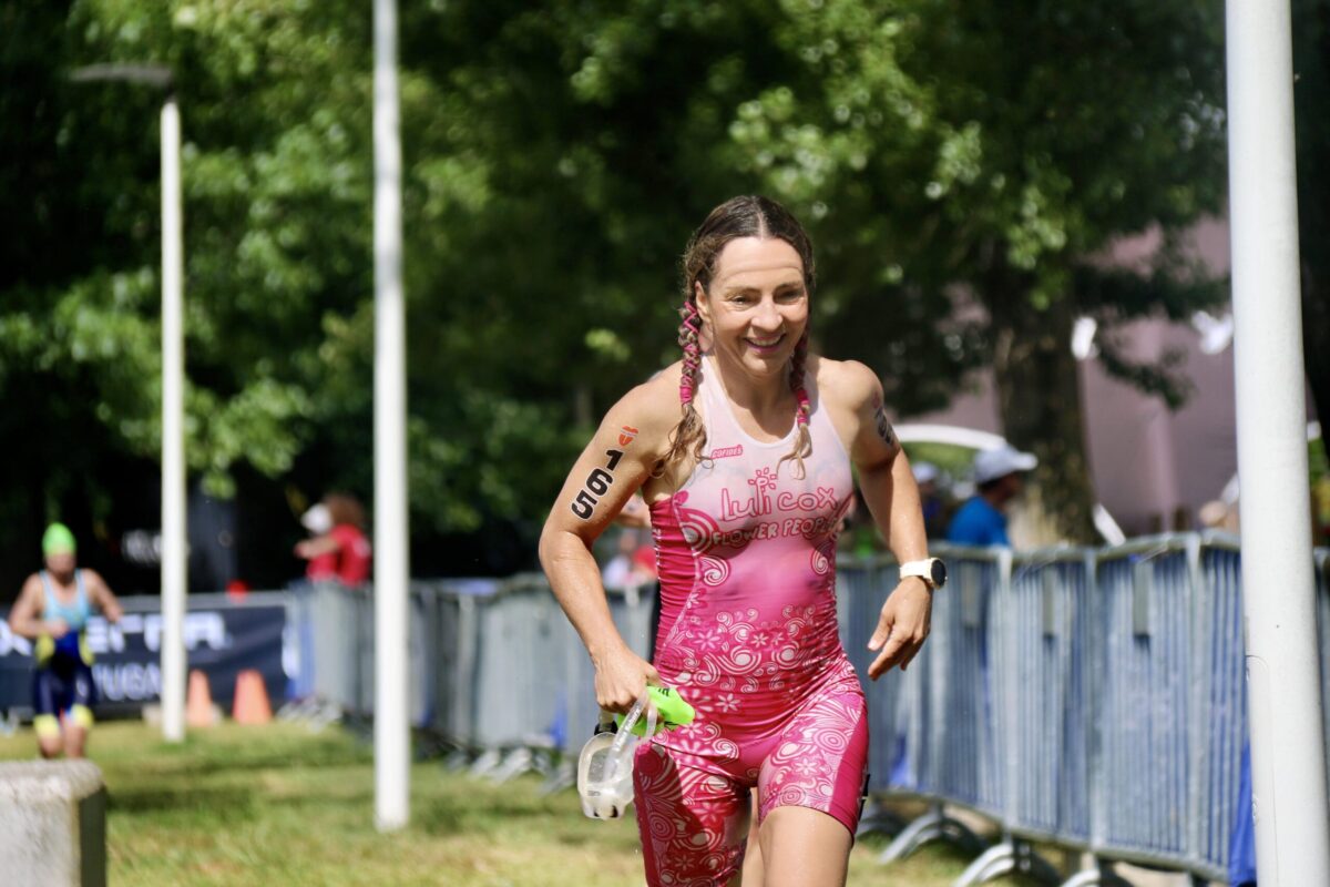 Termino a natação em 41 minutos, dos piores tempos, entre os últimos, mas não “A” última. Um feito. Saio corredo feliz, passo pelo jato de água que tem para lavar os atletas e sigo para transição.