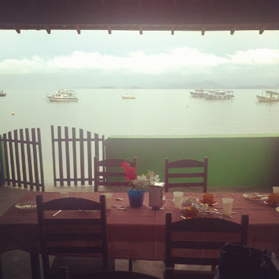 O tempo ruim só chegou na ultima meia hora do dia, quando nós já remávamos sentido a praia Bananal (local aonde 3 anos atrás houve o deslizamento de terra) O Capitão Baiacu resolveu dar uma estendida no remo, pois os quase 40 k eram pouca quilometragem para o seu dia. Enquanto isso, nós curtimos um banho quente e um happy hour em uma varanda com vista do final de tarde chuvosa sobre o mar.