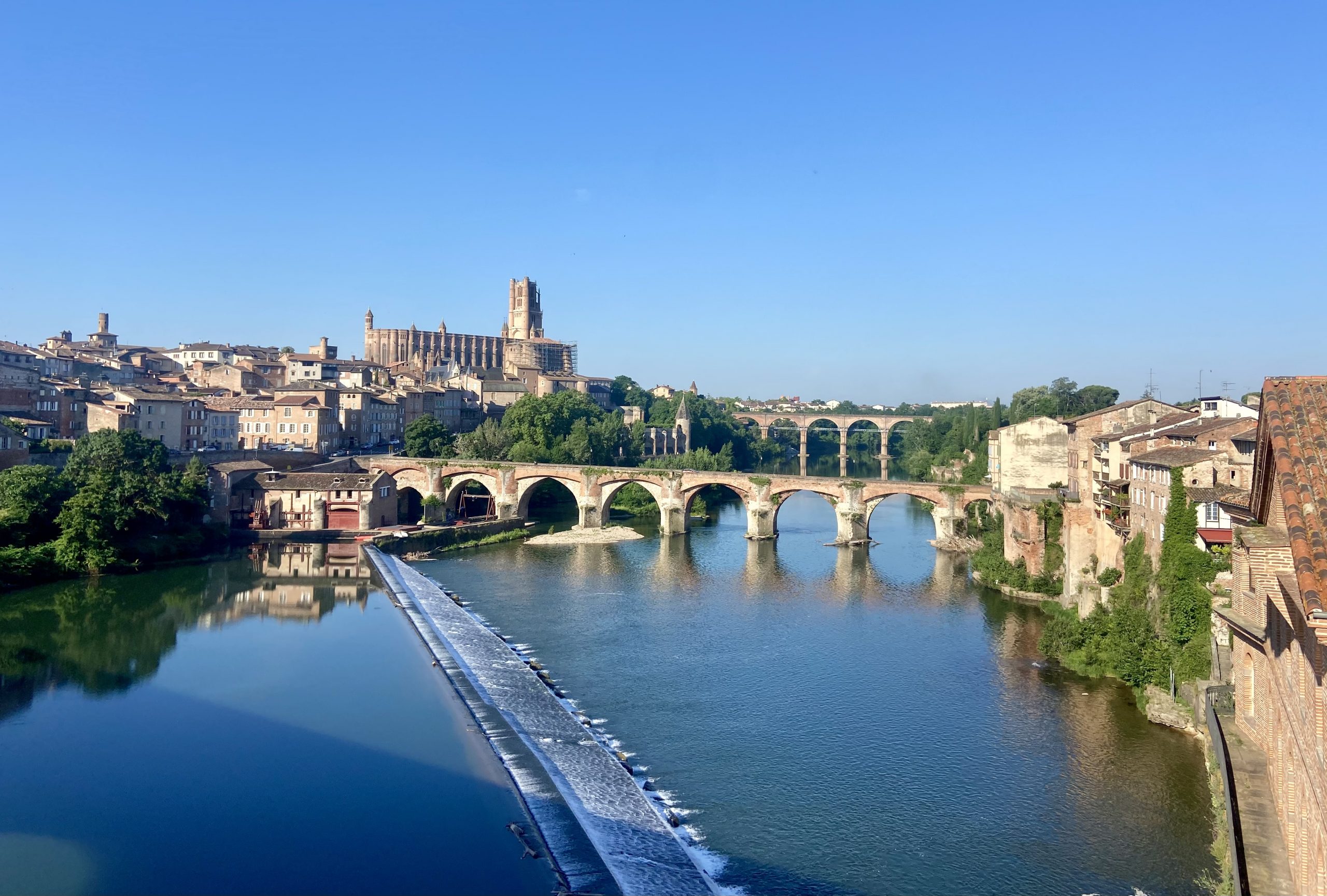 Sai do hotel e fui tirar a foto famosa de Albi, patrimônio da humanidade. Sabe como é, ticar lá isso já que o destino me trouxe aqui e aproveitar para dar Bonjour ao nosso amigo rio Tarn. Linda vista! Mas como toda cidade maiorzinha inclui barulho e carros no pacote; hora de sair pedalando!