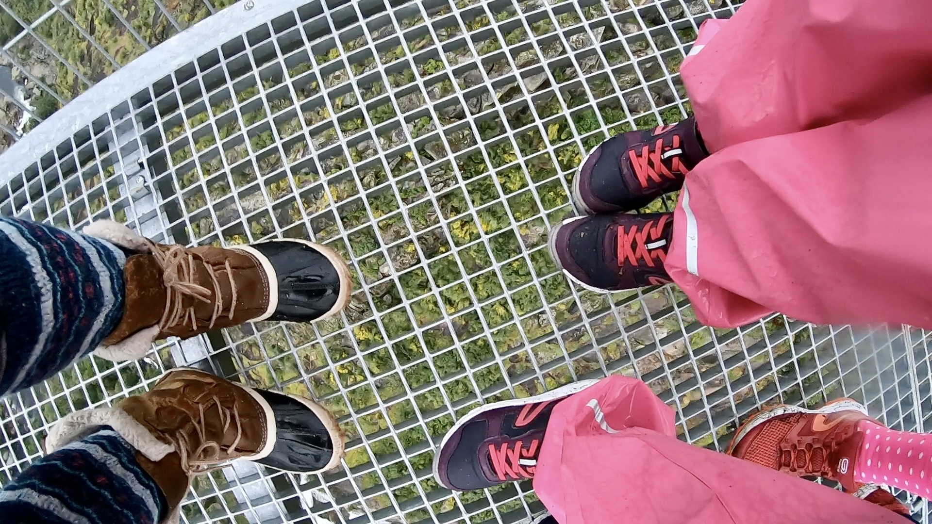 A grelha de ferro do piso tem uma trama fechada, o que na minha opinião, quebra a sensação de insegurança. Pelo visto não fui a única, as meninas transitaram sem qualquer problema.