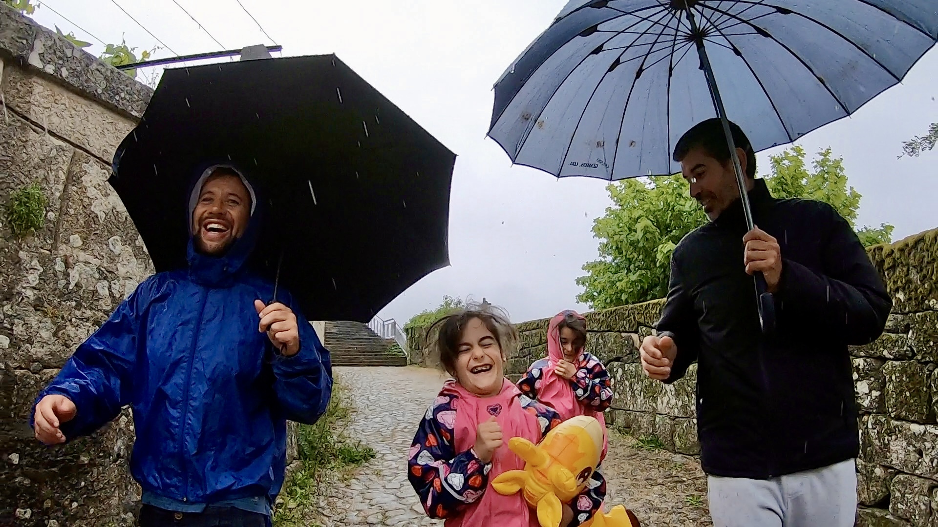 Num grupinho onde as duas crianças são as mais “velhas” da turma; pelo caminho antes de chegar a ponte, a gente ja se molhou tudo o que a gente poderia se molhar. Ainda bem! Não é permitida a travessia com guarda-chuvas! Ah, barraram a nossa bóia de piscina também. Raios!