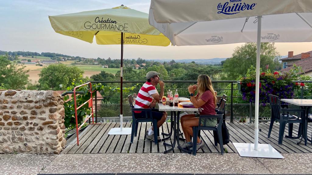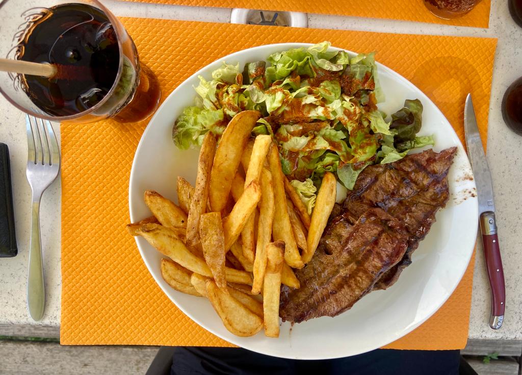 Antes de chegar em Roanne paramos para jantar. Eu que não como carne estava quase comendo. Lurdes, olha o prato com batatas fritas da casa! Oh la la!