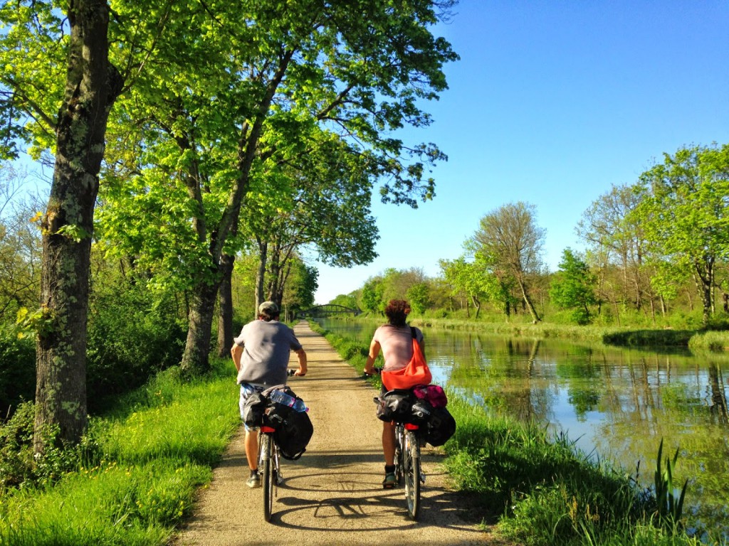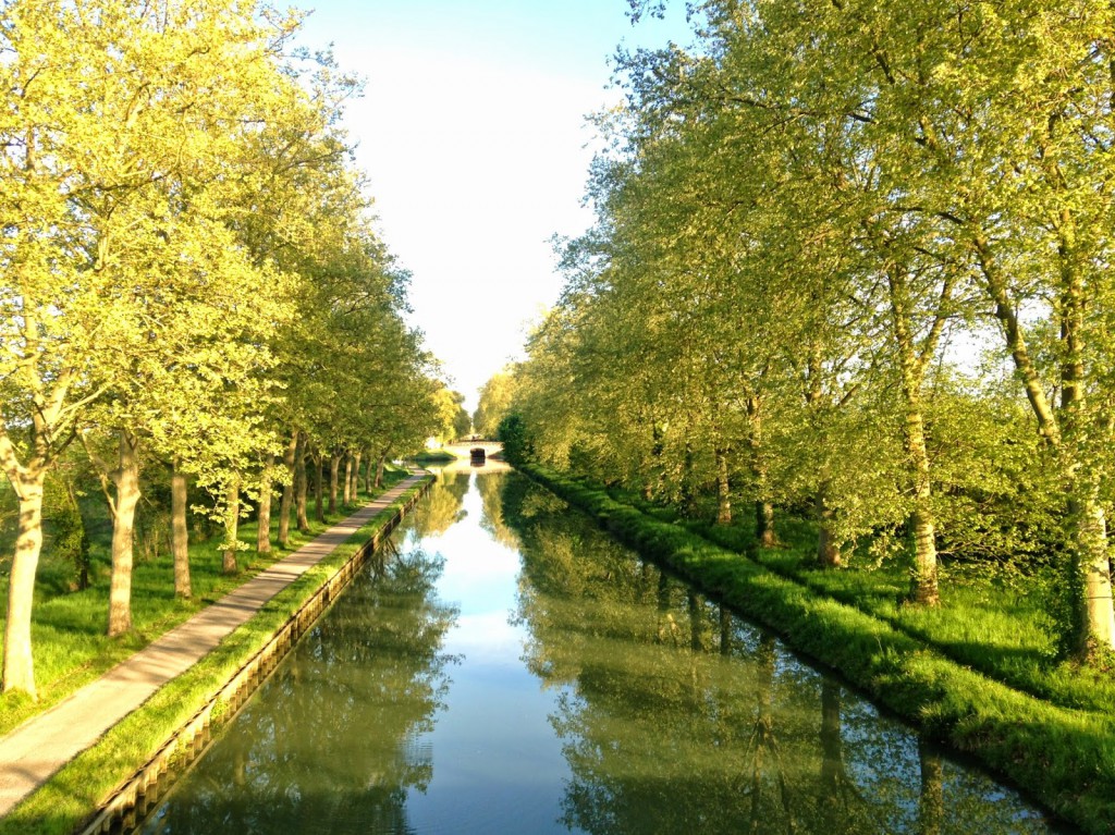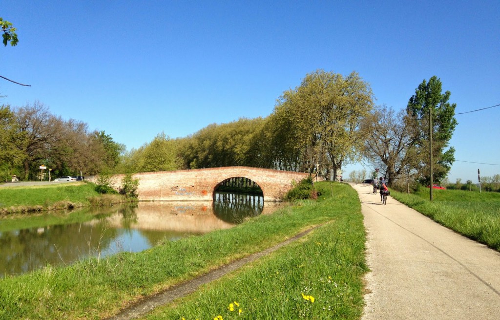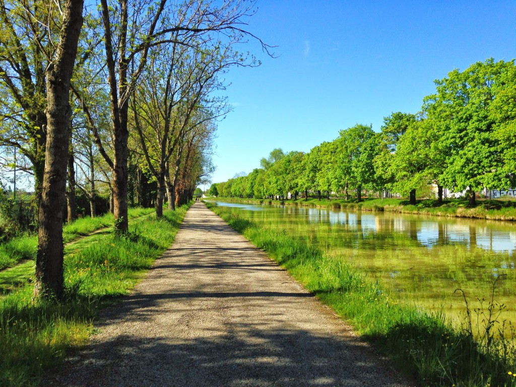 Após o almoço pegamos a Via des Deux Mers, uma rota verde para bicicleta que acompanha o Canal de la Garronne. A junção dos dois mares (Atlântico e Mediterrâneo) é feita pelos dois canais; de Bordeaux até Toulouse o Canal de la Garrone, de Toulouse até o Mediterrâneo pelo Canal du Midi.