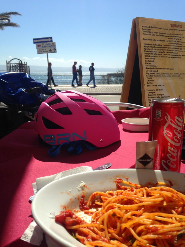 A estrada estava linda, pequena quase sem carros e com muitas flores no acostamento. Meu corpo hoje já está sentindo o cansaço acumulado dos dias e com um pouco mais de pedal já estava querendo fazer outro detour para almoçar. Mais uma vez toca a descer para a costa, uma cidadezinha linda e pequenina e acreditem tinham 2 restaurantes abertos!