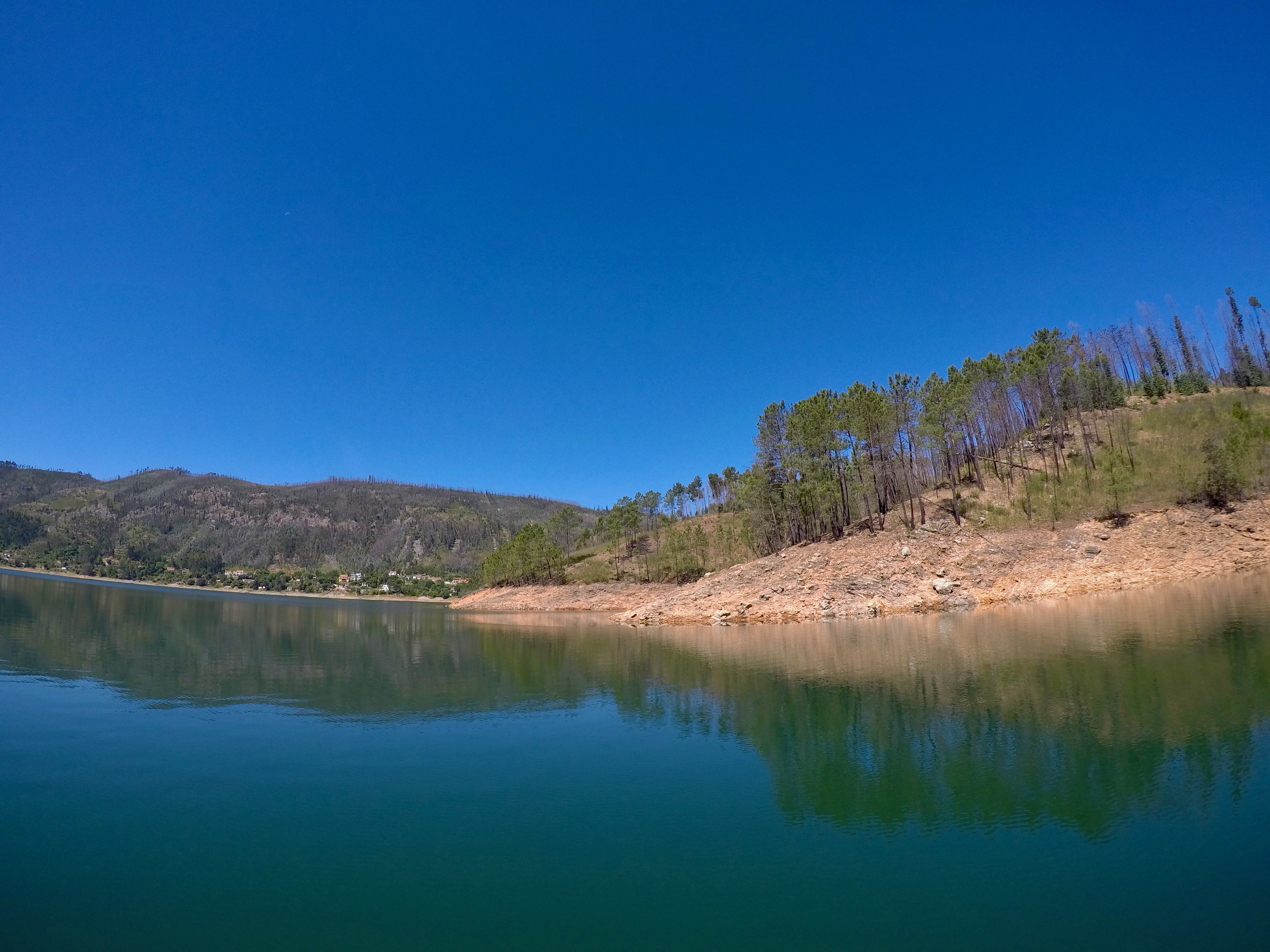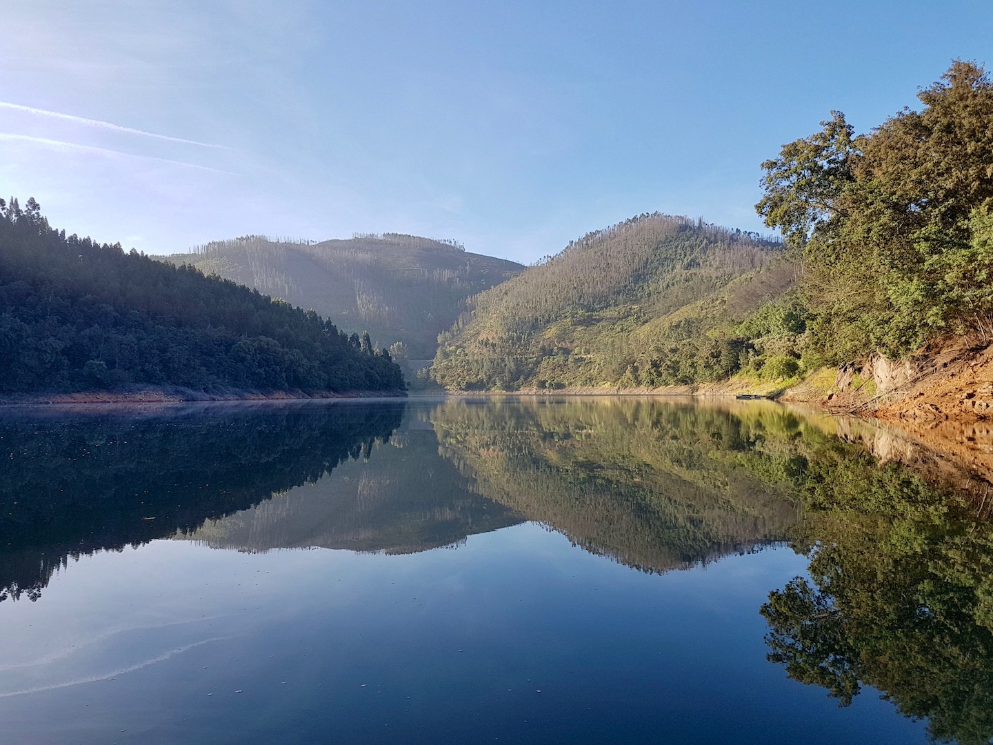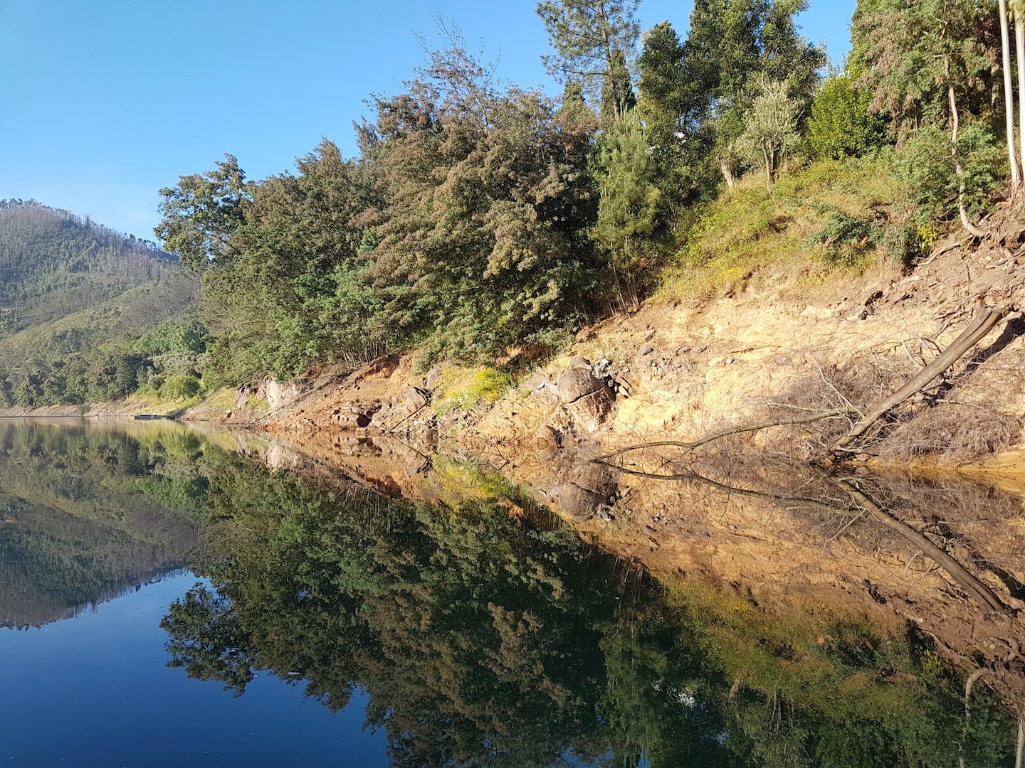 Entramos no rio Zêzere bem cedinho para que pudéssemos remar ainda sem o vento. A paisagem fica duplamente maravilhosa nessa hora do dia.