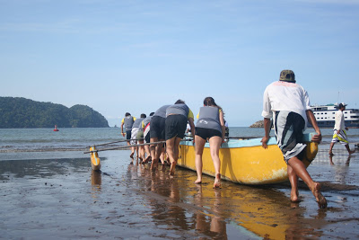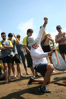 Depois de algumas dicas e aulas sobre como remar, as equipes já foram divididas. Seriam 4 baterias e cada embarção levaria duas equipes. Oito pessoas mais o timoneiro, um local que ia fazendo o leme para que os barcos não seguissem desgovernados.