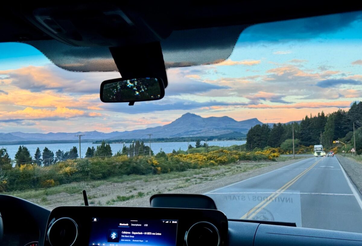 A estrada é linda, já temos aquela primeira impressão dos enormes lagos azuis emoldurados por cadeias de montanhas monumentais. Algumas com topo nevado. O por do sol deixa tudo ainda mais colorido!
