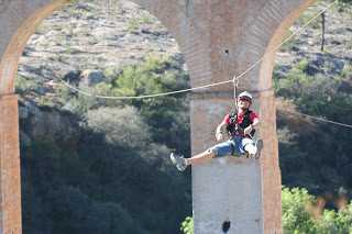 O Primeiro dia foi um intensivão. Já saímos logo cedo e fomos à uma pista de motocross que fica ha 1.30h daqui. Lá ficamos curtindo os saltos incríveis, ainda dei uma volta na pista de quadriciclo, e fizemos uma tirolesa sobre ela também. Segundo programa do dia até um aqueoduto ver os feras da Red Bull com suas bicicross…os melhores do mundo estão aqui! E last but not least os BBoys! Impressionante o que os caras dancam! Isso tudo já é parte da divulgacão do evento principal que acontece no sábado. Acabei de chegar de volta no hotel e estou morta ainda sentindo jetleg! Amanhã tenho que montar minha bike. O Antonio vai correr com uma bici emprestada que chega no dia da prova hehe e disse que nos últimos dois meses ele pedalou duas vezes, porque só neva na Espanha. Não consigo parar de rir…figurinha master!