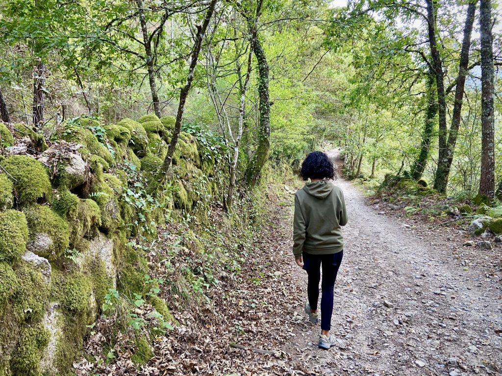 O verde uma vez das árvores, já se intensifica nos musgos sobre as pedras, e as cores quentes da estação de outono ja começam a tornar mais belas as paisagens.Estamos numa via romana, ruínas de lugares de descanso dos viajantes enriquecem nosso caminho. O que me encanta mesmo é a natureza; Corgo da Fecha, vamos a um poço de cachoeira com uma cor de agua indescritível. Mesmo num dia frio existe a vontade de pular…hum, melhor não! Ta gelada! Olha a cor da água.