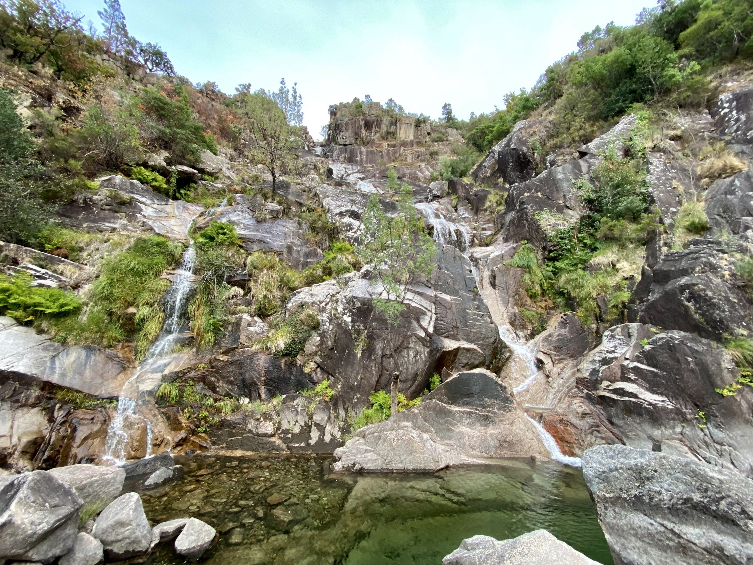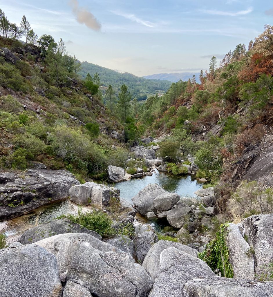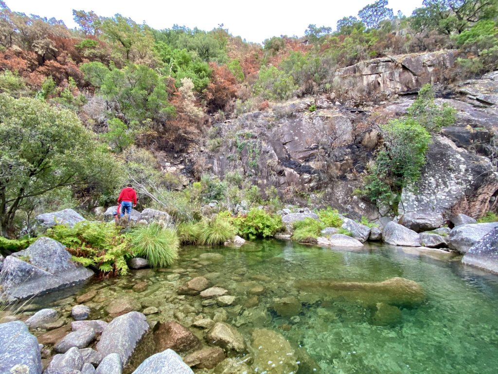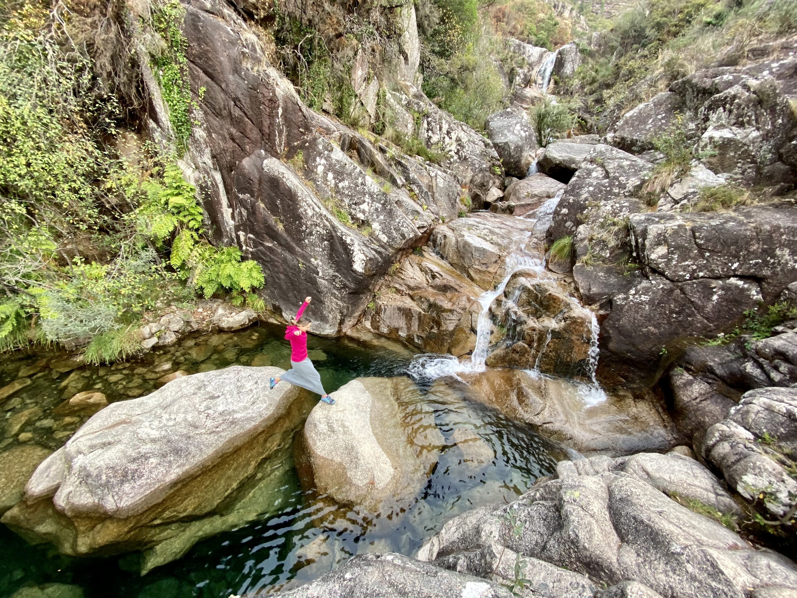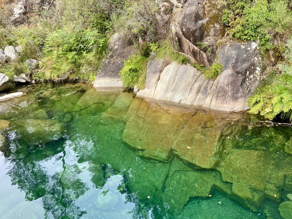 Subindo o rio, escalando pedras e rochedos é possível ir descobrindo varias piscinas ao longo da aventura, até chegar numa maior. Outubro outono e dia de semana temos quantas piscinas quisermos só para nós.