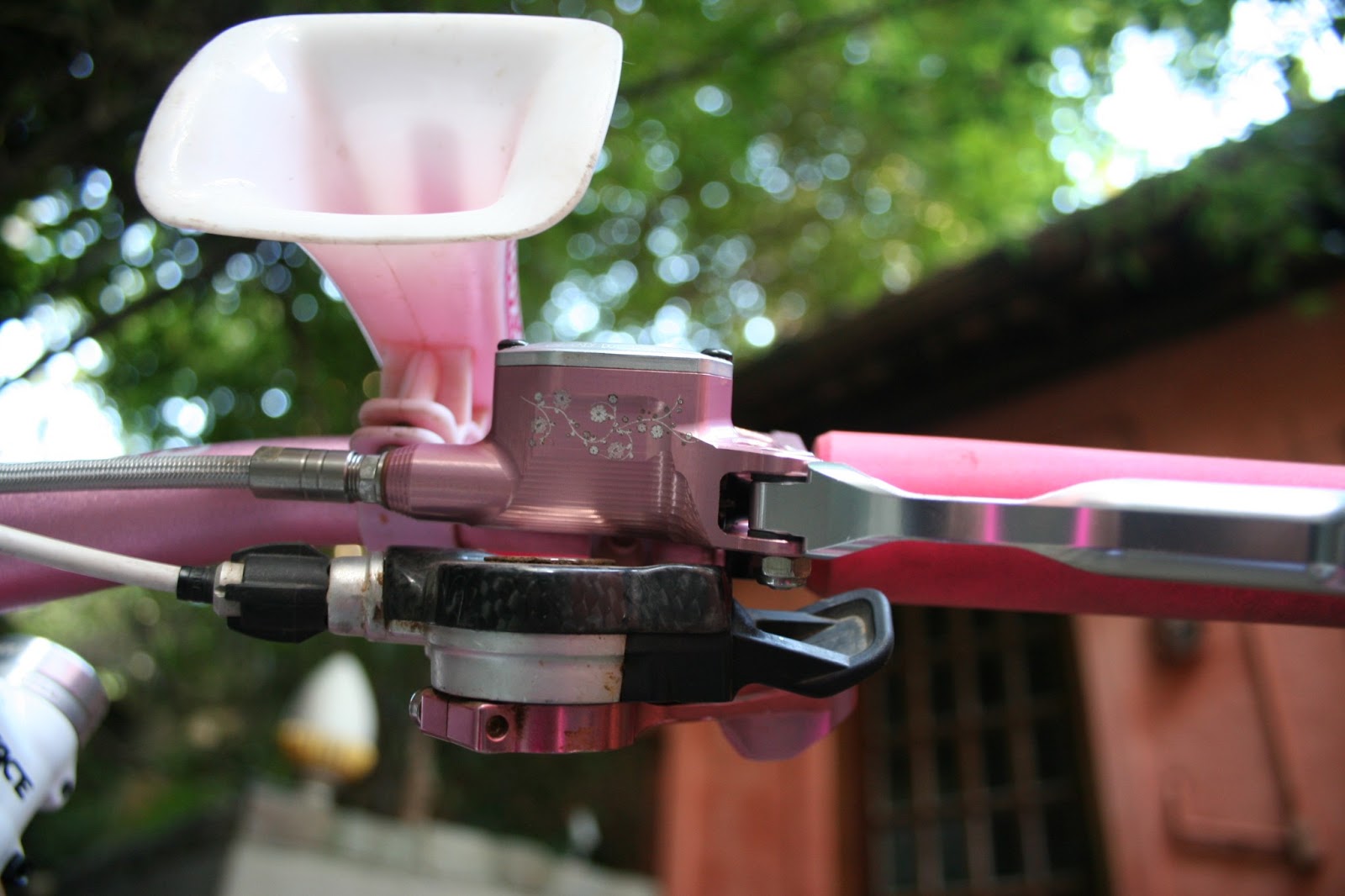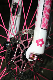Descobri freios cor de rosa que tinham flores por todos os lados (olha o detalhe do disco que coisa mais linda!)