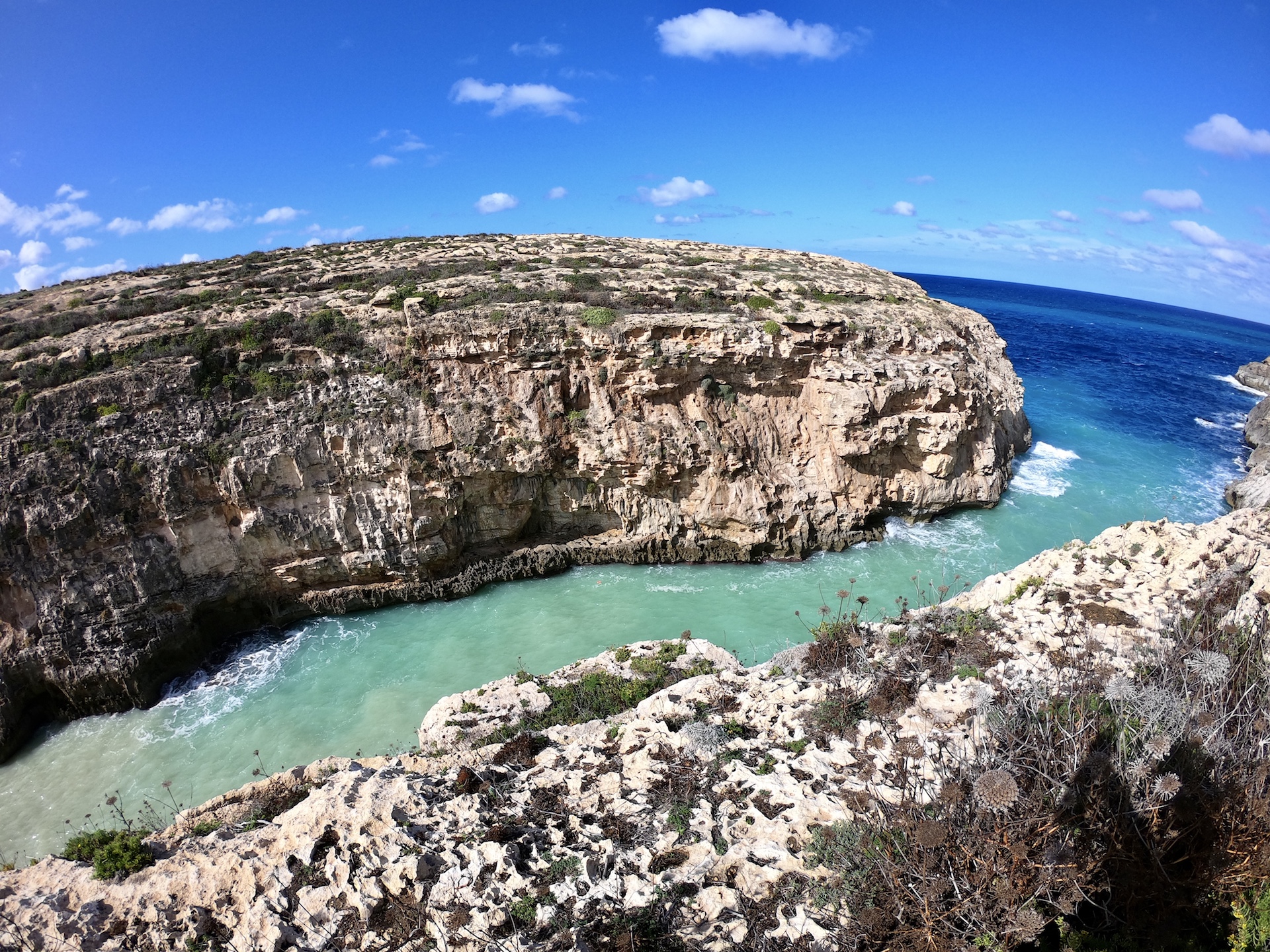 Chegando na costa achei a Baía de Djwera. Me enfiei nuns trilhos e cheguei bem pertinho do penhasco.