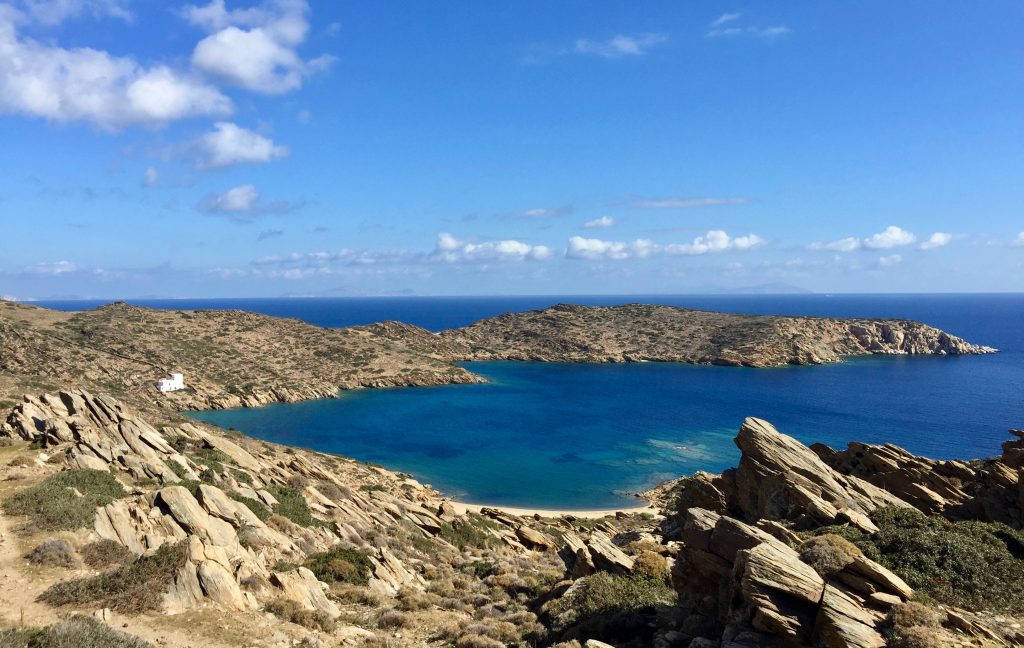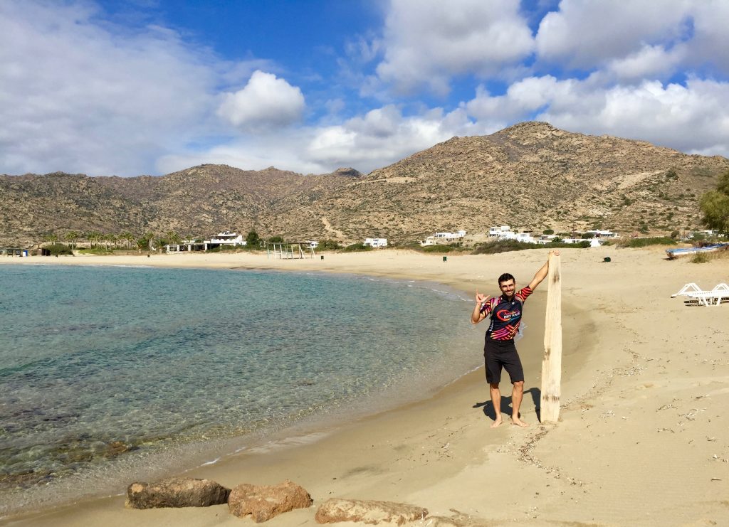 A ilha em outubro parece fantasma não tem turista nenhum, as poucas pessoas que vimos nas ruas eram moradores. Tínhamos uma ilha só para a gente.Como o ponto mais alto já tinha sido conquistado no dia anterior decidimos ir a uma das praias mais lindas da ilha; Magganari.Chegar lá não foi uma tarefa fácil; quase 25 quilômetros com 630 m de acumulado. É assim; “Você sai do nível do mar, sobe, sobe, quando chegar do outro lado da ilha, desce para a praia.”
