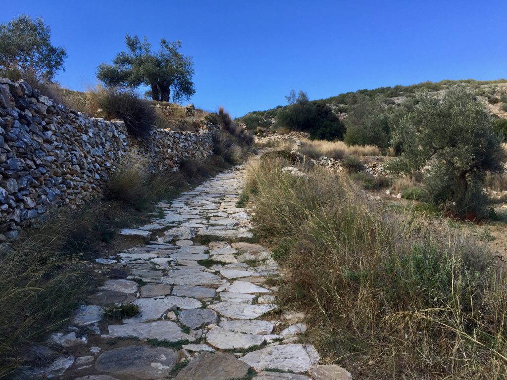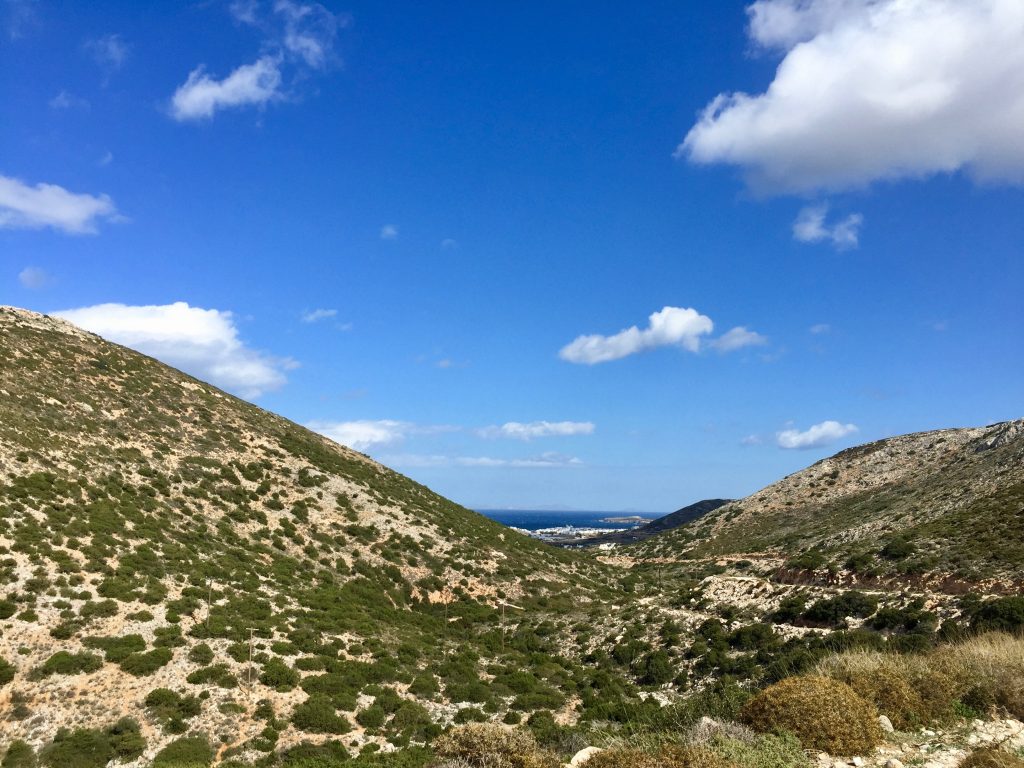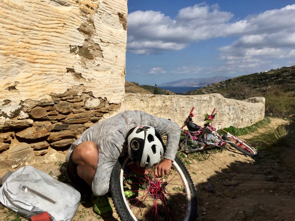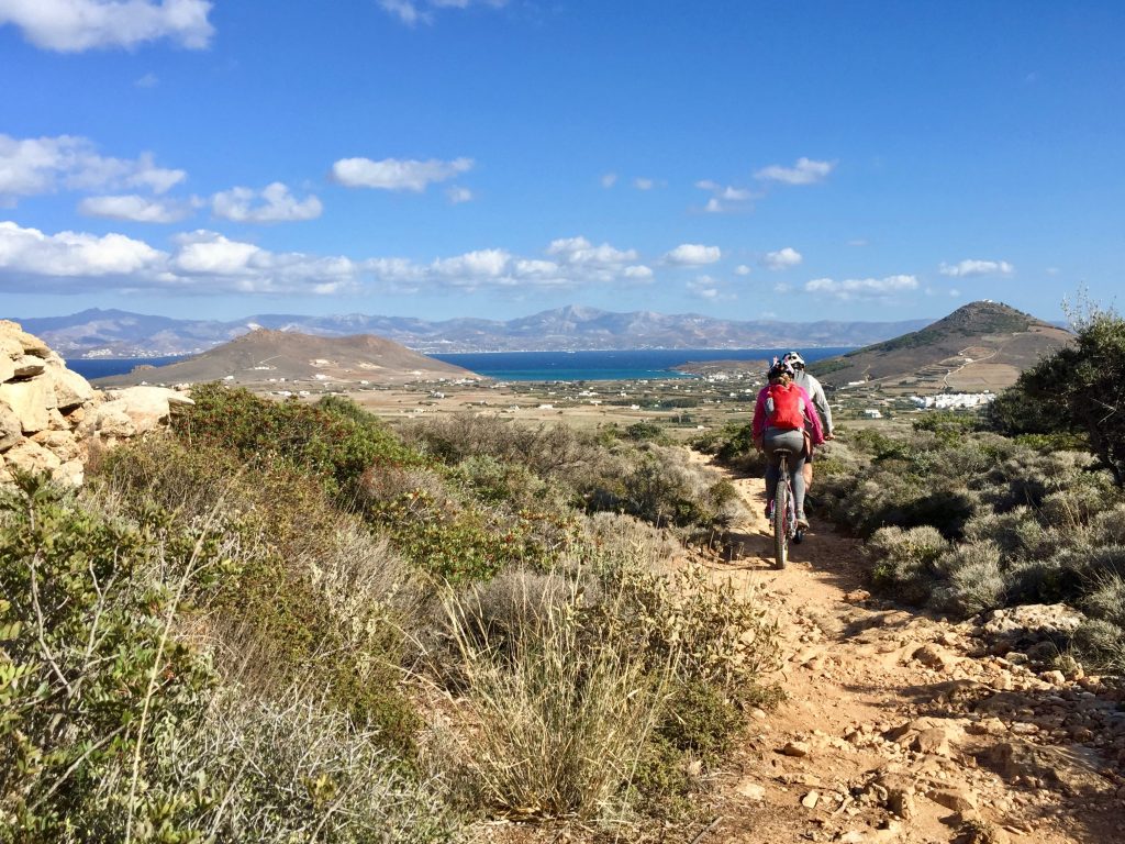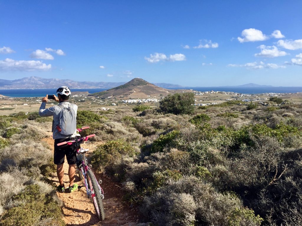 O ponto alto (literalmente) do dia foi quando chegamos a Lefkes a cidade mais alta de Paros, de onde parte uma trilha de 3 quilómetros ate Prodromos, outro vilarejo mais abaixo. O caminho milenar (!) bizantino em pedras de mármore corta a montanha e a paisagem misturava montes, praias, num paisagismo emoldurado pelo céu azul. Um downhill técnico divertidissimo!