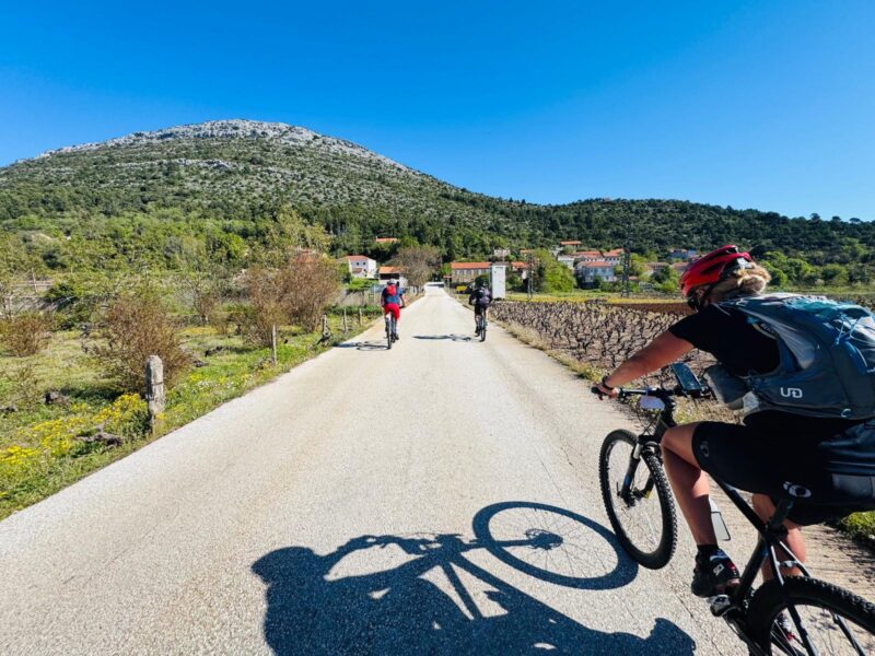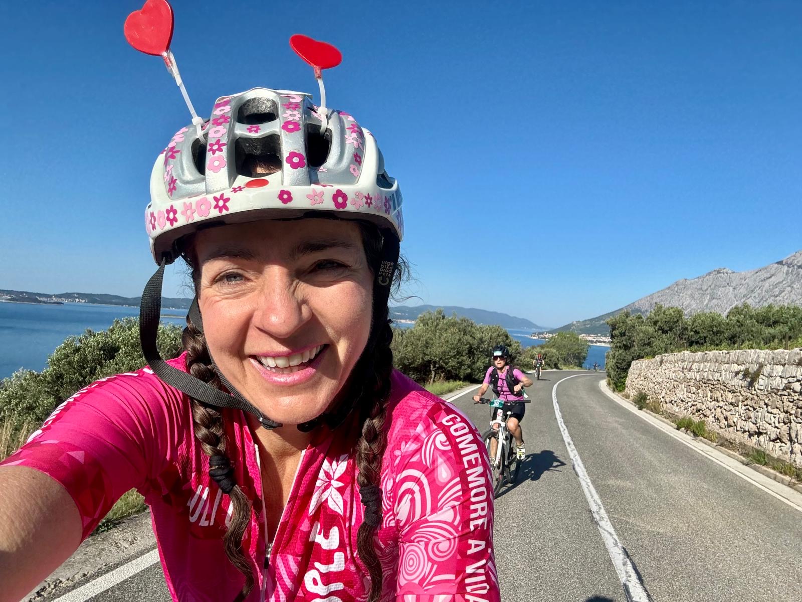 Depois de subir a montanha e pedalar um pouco no centro da ilha atravessamos um túnel que nos transporta a um cenário com uma vista de um mundo azul com montanhas no horizonte. Uau!