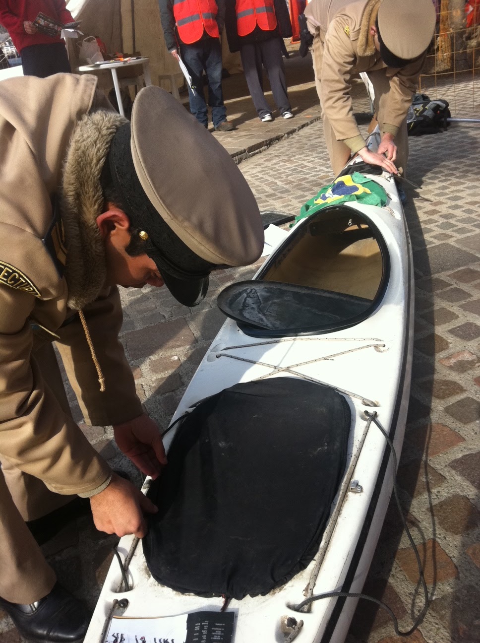 Antes de entrar na área de transição a Marinha checa um a um para ver se as embarcações estão de acordo com as exigências, e ainda conferem o neoprene (item obrigatório) dos atletas.