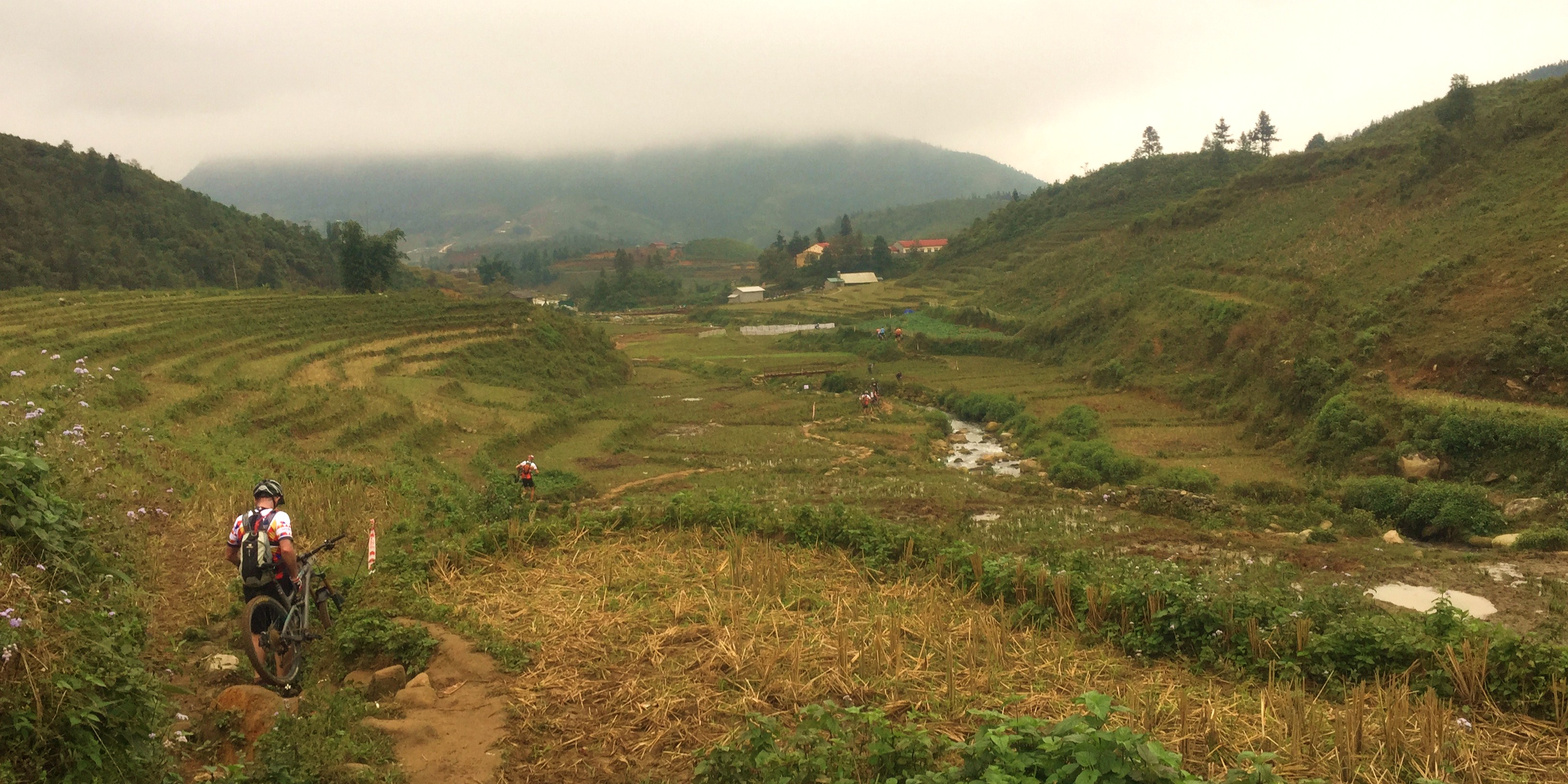 Sapa largadaHoje o dia era bem curto com subidas não tão longas porém algumas bem ingrimes. Largamos perto do centro de Sapa. Após um rock Garden insano, um trecho de push bike que passava por uma aldeia, plantações de arroz, pontezinhas mal conservadas. Essa parte já me deu uma ótima vantagem porque além de ter largado na frente, levava a bike calibrada pelas corridas de aventura.